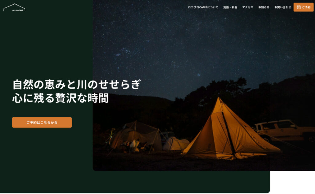 ローコードテーマ『Snow Monkey』を使用し、キャンプ場のサンプルサイトを作成しました。